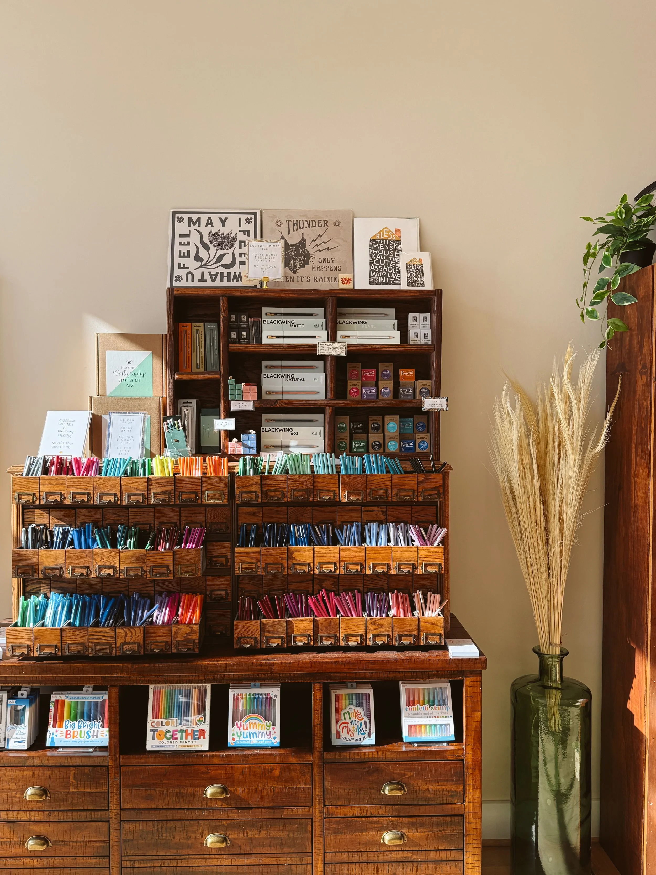 Don’t you love when businesses make clever shopping so much easier? May Day Paper & Post – a Kansas City mainstay, where I am concerned – pretty much stocks all the beautiful paper products. Notebooks, pads of paper, every pen you could have dreamt of. A wall of quirky and specific cards that you will often find yourself laughing out loud at, especially if you are alone in the space. Wrapping paper, invitations, and quirky little desk gifts. This space is where you can really revel in some magic.