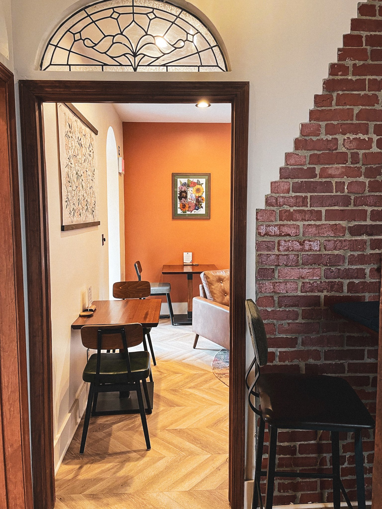 What is perhaps most striking about the space is the variety and amount of seating in the space. There is a first floor, with seating at the bar and in the lobby area, with an additional two rooms to find joy in. One room on the first floor has a gorgeous fireplace, luscious plants, and a well-stocked library that you are encouraged to pull from during your stay in the space.