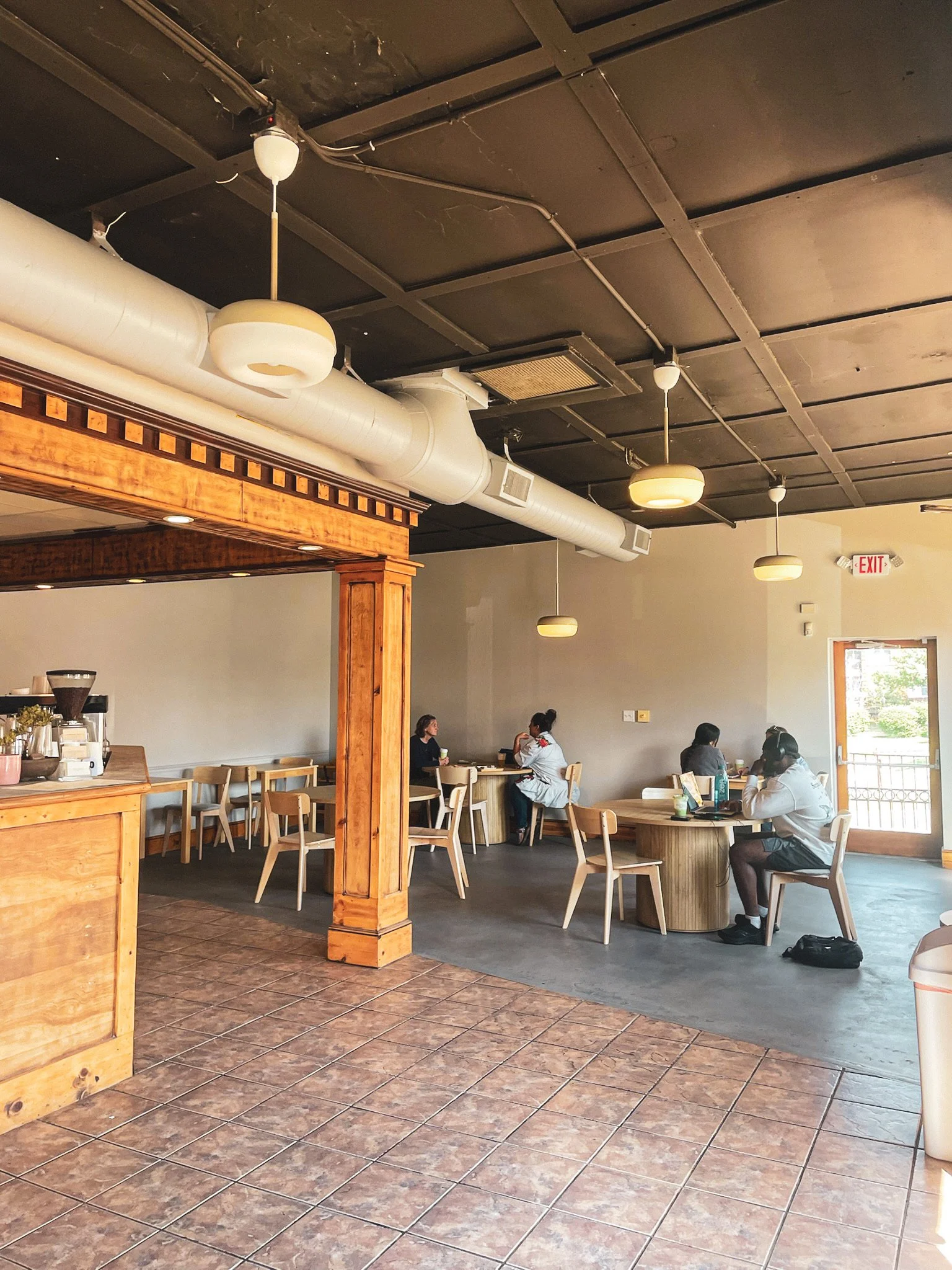 While the shop is minimally decorated, there are several wooden tables and backed chairs to the right of the counter. Clean, white walls bring a sense of calm to the space, with ample lighting and natural light from the windows for those who are visiting, studying, or working. The absence of clutter in the space is a focal point in itself.