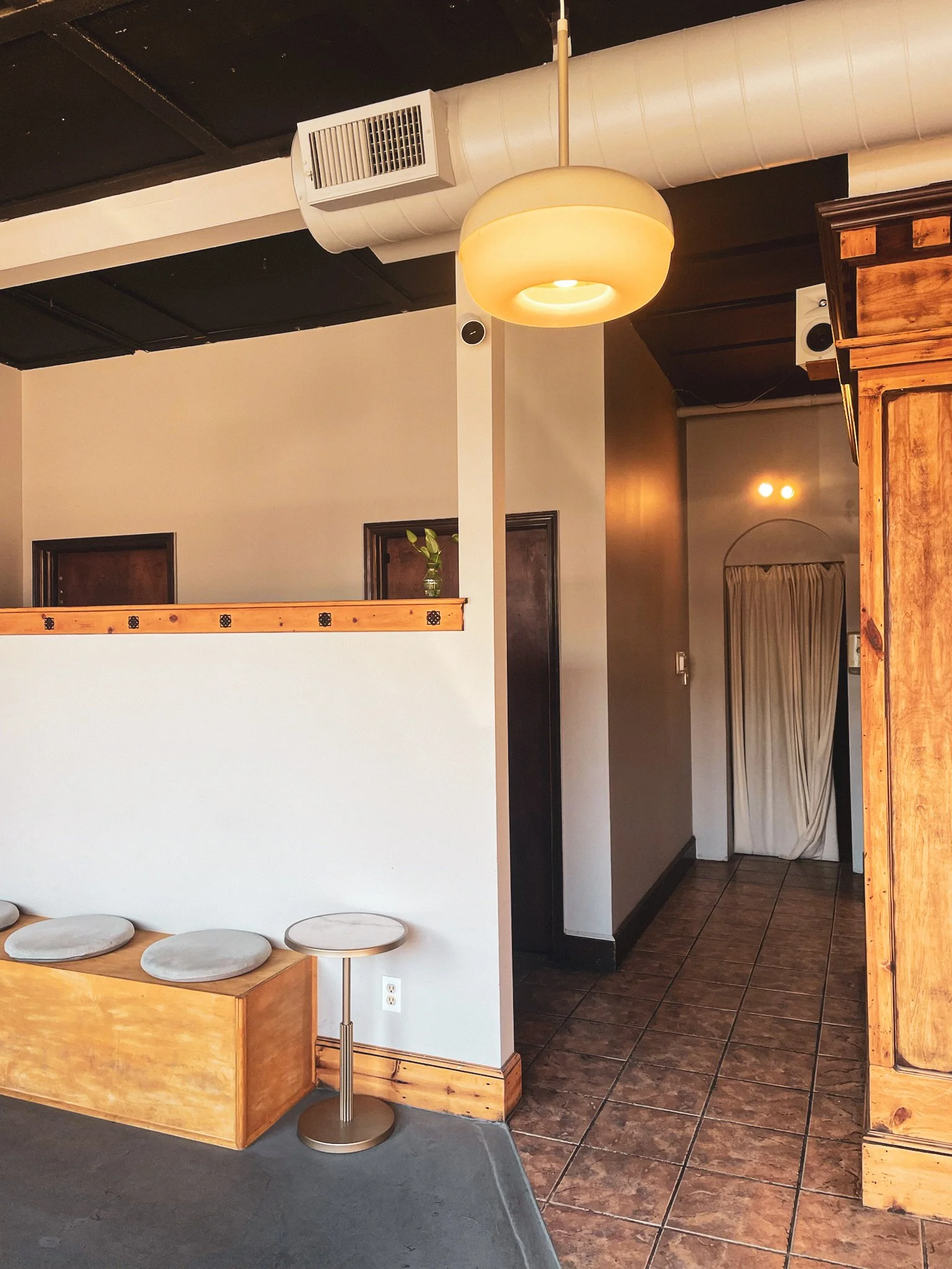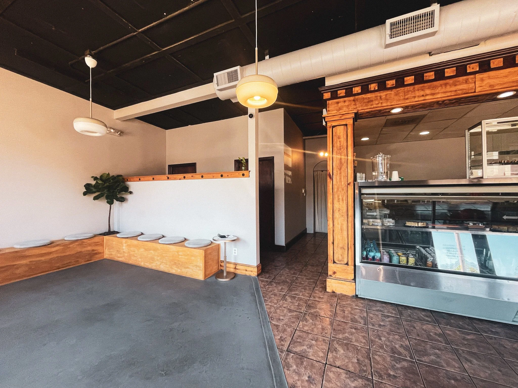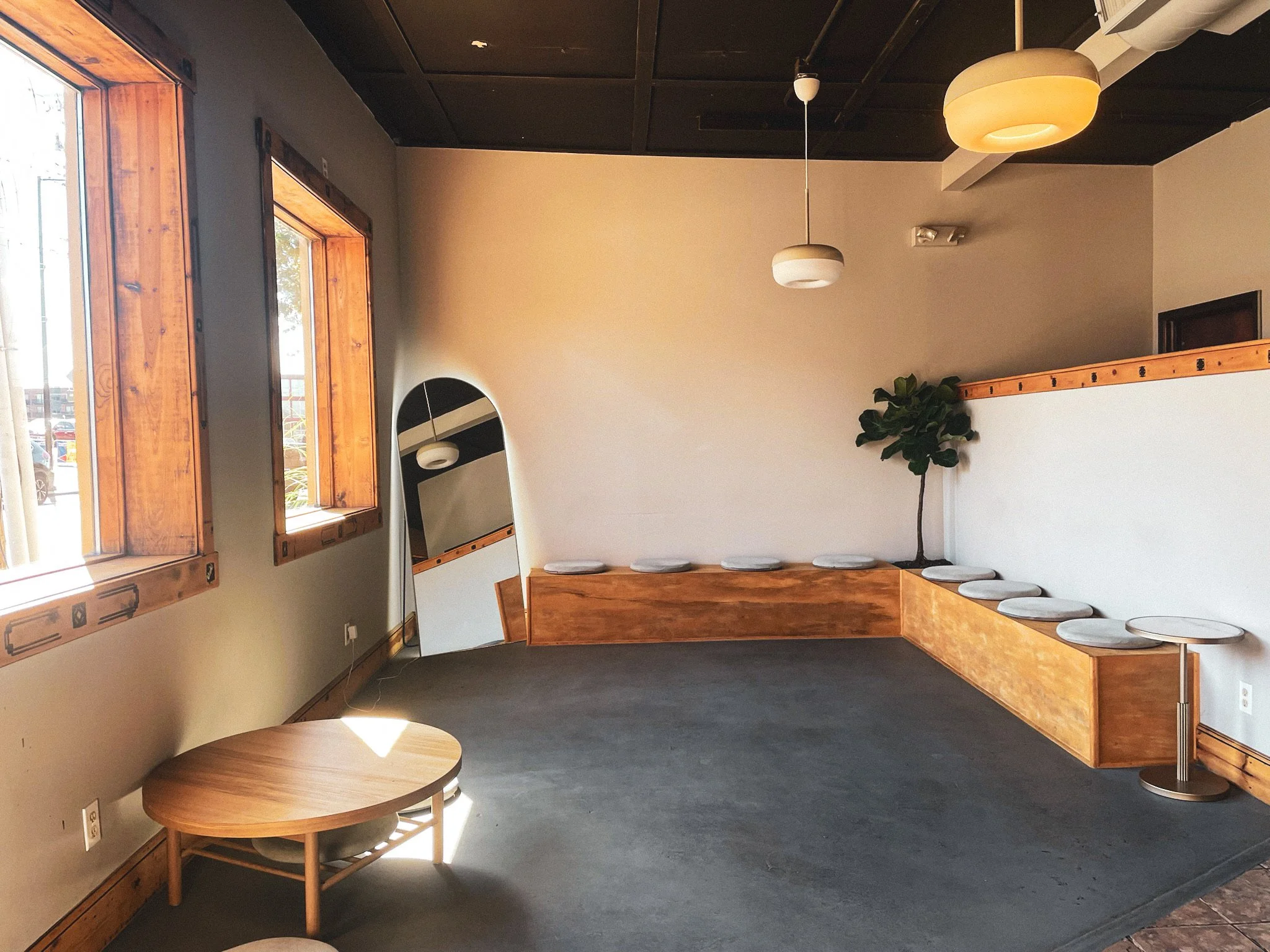 To the left of the ordering counter, there is an even more spacious area. It honestly looks more like a small physical therapy or yoga space, but has an array of pillows for both floor seating and to sit along one of two attached wall benches. A tree brings greenery into the area, and a well-placed floor-length archway mirror adds depth to the space.