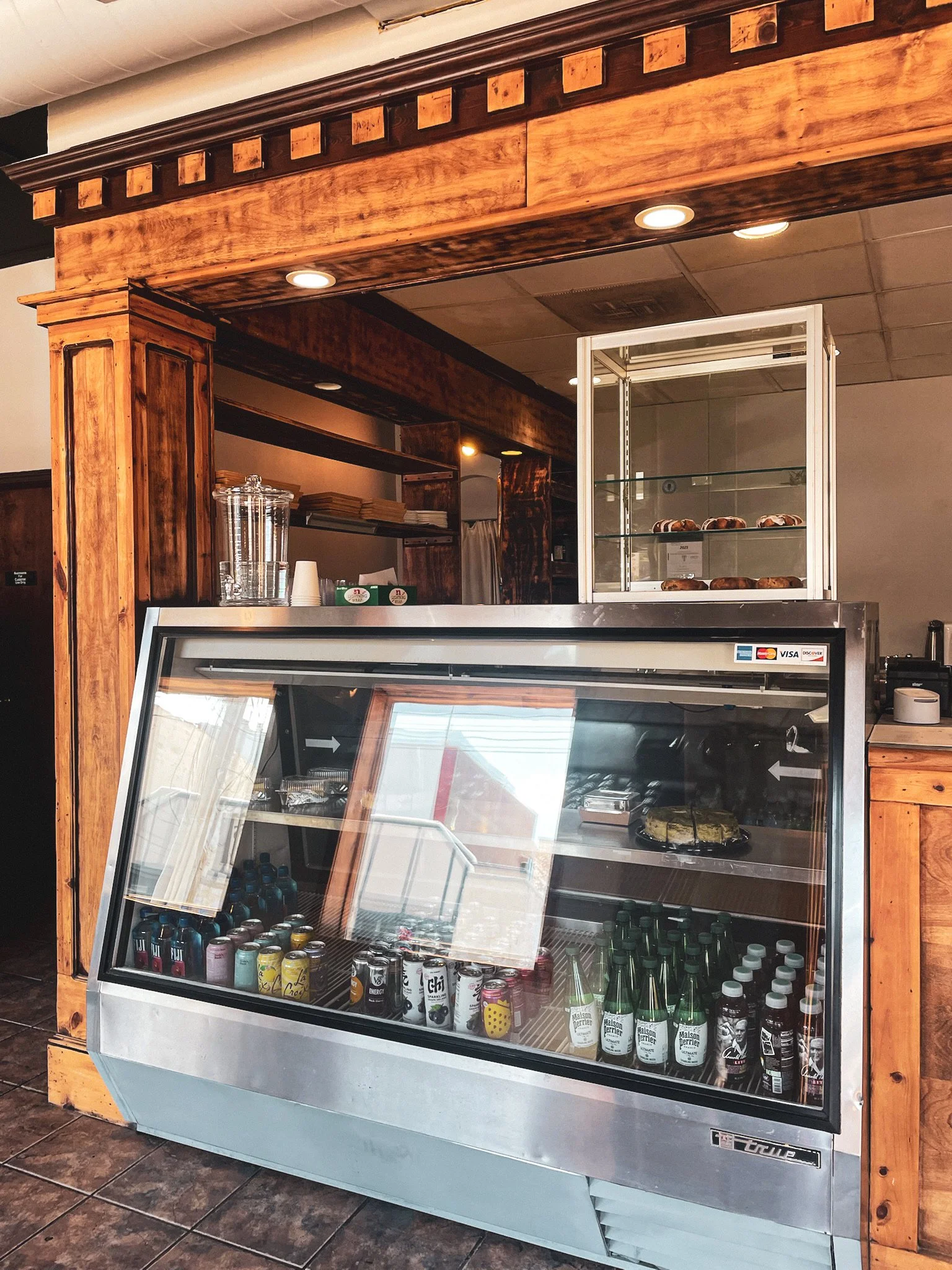 The front cabinet has far less dessert and breakfast pastry items than its predecessor. However, bottles and cans of tasty sodas, juices, and waters line the bottom shelf, and the top shelf seems dedicated – at least for the time being – to baked goods like cheesecake and cookies. The shelving above had a couple of bread items in it as well to choose from.