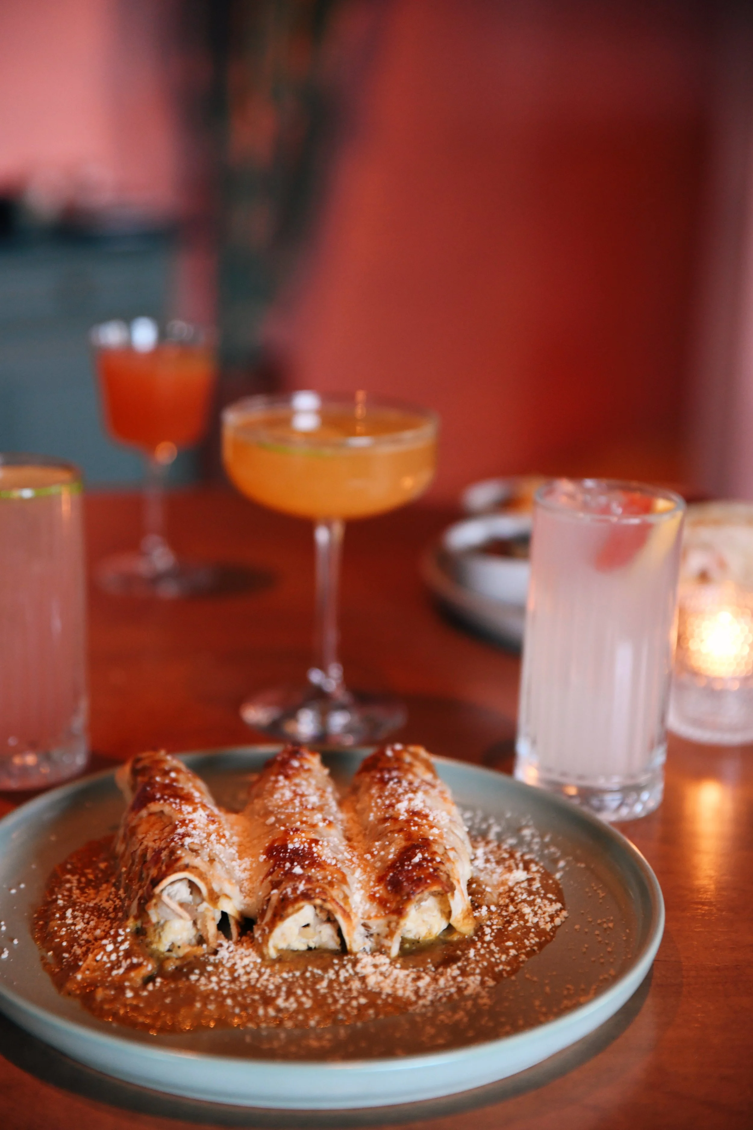 Across the street, the new kid on the block, Crossroads Cantina, offers a more food-focused menu and dining experience. Its indoor high-table section is both cozy and elevated, with natural, hand-cut tiles, carved wood millwork, and painted cement accent walls. The convertible dining space with towering birds of paradise and floor-to-ceiling windows lets in as much natural light as the winter will offer, making it easy to imagine warmer patio days on the horizon. I shared the rotisserie chicken served on a bed of esquites and the rojo enchilada. I also devoured the homemade tortilla chips. And yes, I asked for a box to take what was left of them home.